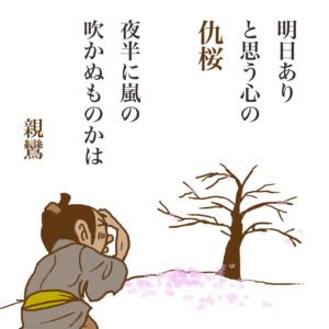 明日あり と思う心の 仇桜 夜半に嵐の 吹かぬものかは